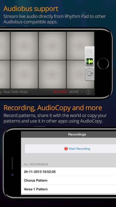 Play drums on iPhone and iPad with Rhythm Pad. Rhythm Pad includes professional features such as extreme low latency, high quality drum samples, recording feature, AudioCopy and Audiobus support. Rhythm Pad is the smartest way to play drums on your mobile devices.